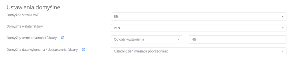 Poniżej „Domyślnego terminu płatności faktury” użytkownik będzie miał możliwość wskazania również Domyślnej daty wykonania / dostarczenia faktury. Pola do wyboru to: