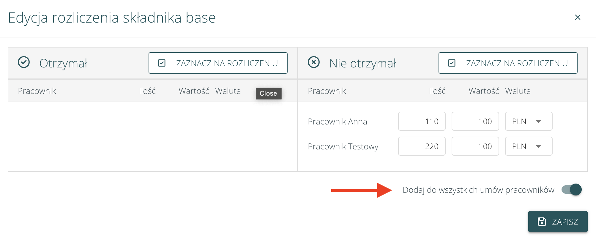 Przy edycji składnika z poziomu podsumowania umożliwiono wybór, czy ma zostać dodany do wszystkich umów, czy tylko jednej. Opcja „Dodaj do wszystkich umów” dostępna jest nad przyciskiem „Zapisz”: