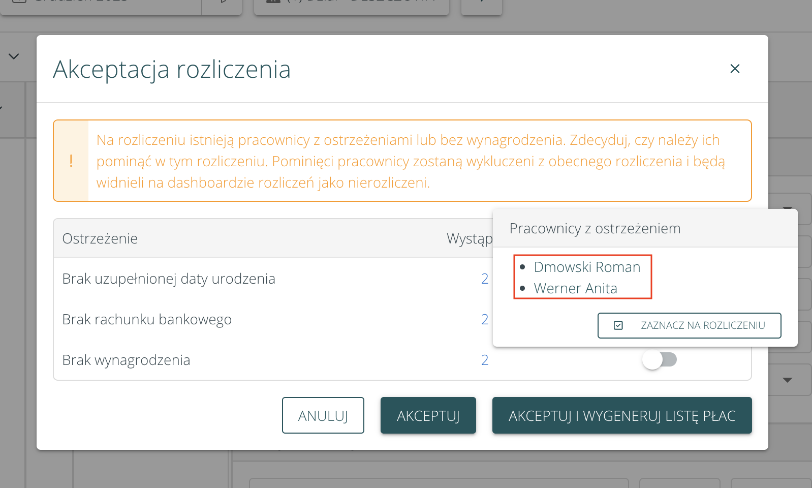 Dodano linkowanie do profili pracowników wylistowanych m.in. podczas edycji stawek, terminu płatności oraz w ostrzeżeniach podczas akceptacji rozliczenia. Pozwala to sprawniej przejść do profilu pracownika i przeanalizować przypadek: