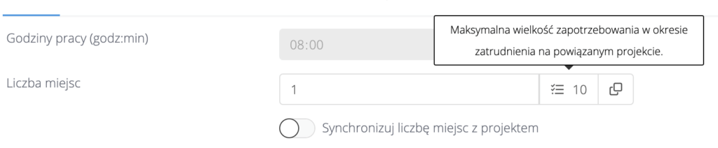 Wyłączenie opcji pozwala manualnie wpisać liczbę miejsc na rekrutacji (liczba miejsc nie będzie synchronizowana z projektem). Po wyłączeniu opcji, w polu pojawi się:
