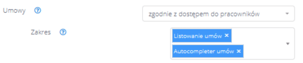 • Obie dodatkowe opcje (Listowanie umów” oraz „Autocompleter umów”) w polu Zakres zostały dodane również do pozostałych uprawnień do umów, poza opcją braku dostępu do umów