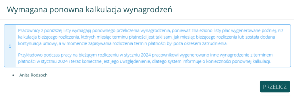 Przykład: Pracownik posiada umowę do końca lipca 2024 r., i wygenerujemy rozliczenie za lipiec z terminem płatności na sierpień, które zostało zapisane na pierwszym kroku. Następnie dodajemy kolejną umowę, która ma wpływ na wygenerowane rozliczenie. Po przejściu do generowania Listy Płac na rozliczeniu, pojawi się komunikat o konieczności przeliczenia wynagrodzenia:
