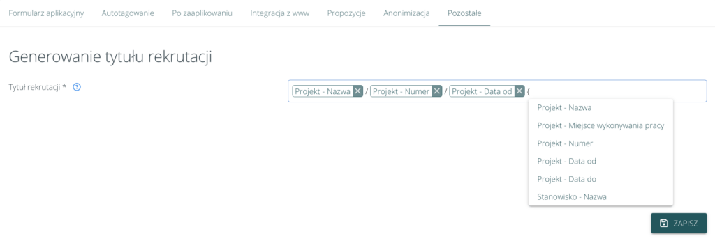 Umożliwiliśmy konfigurację tytułów rekrutacji, które będą generowane automatycznie podczas dodawania rekrutacji. W konfiguracji tytułu można dodać znaczniki dot. projektu, czy stanowiska oraz własny tekst.