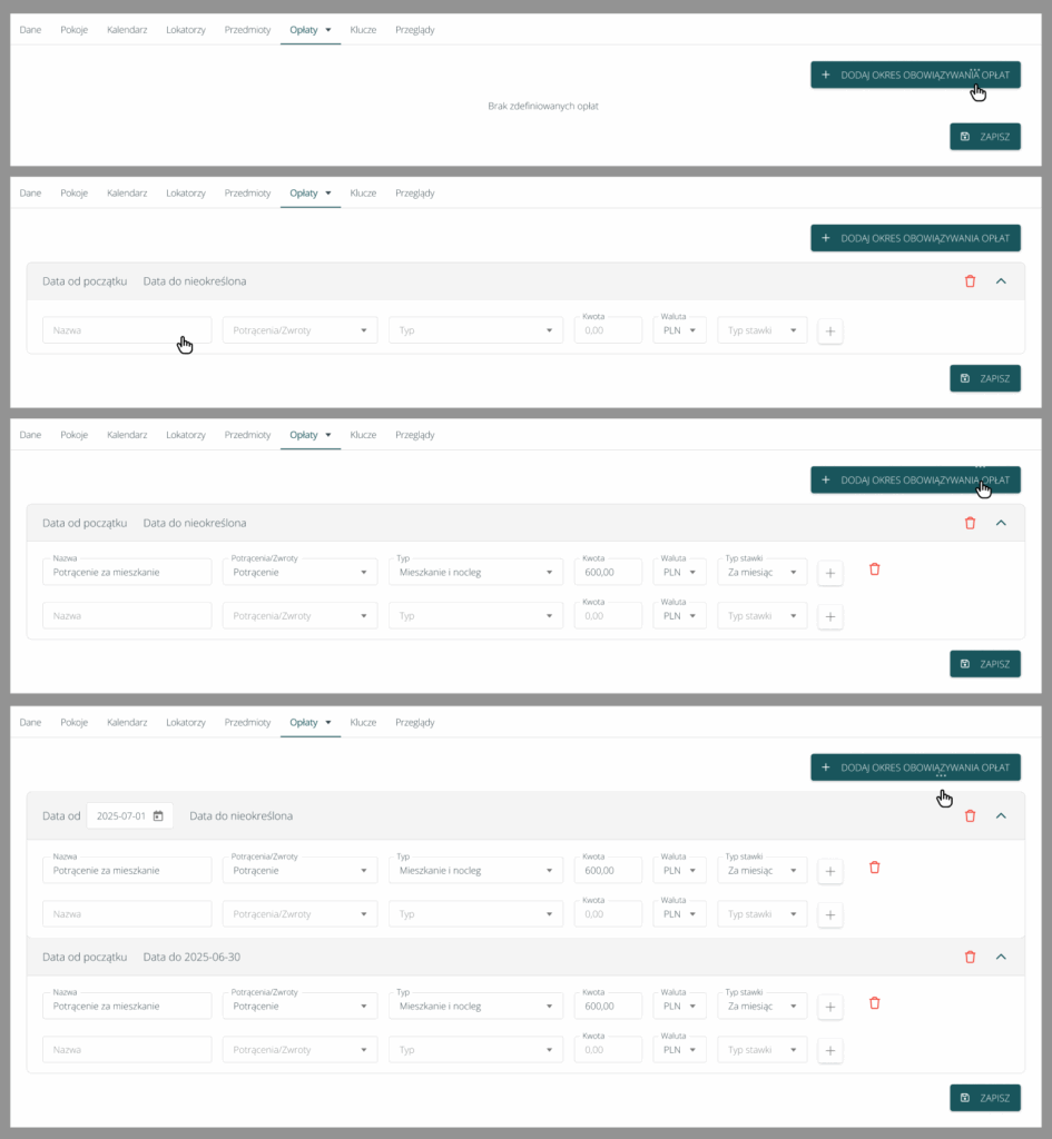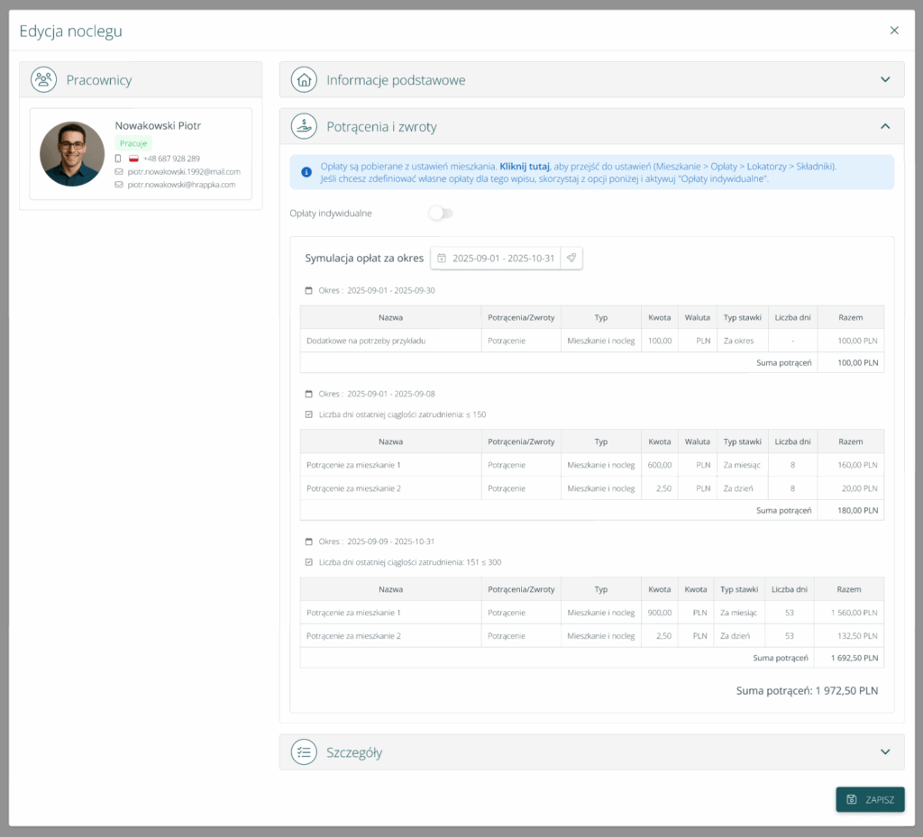 Na wpisach noclegowych potrącenia i zwroty zostaną przeniesione z sekcji „Szczegóły” do dedykowanej, odrębnej sekcji. W ramach tej sekcji pojawi się dodatkowa funkcjonalność – symulacja opłat za okres.