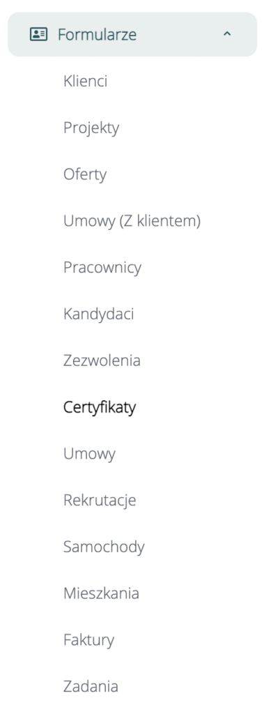 Formularze zostały przeniesione z Ustawienia > Konfiguracja > Formularze do Ustawienia > Formularze. Rodzaje obiektów, które posiadają możliwość konfiguracji formularzy znajduje się również w menu (poniżej).