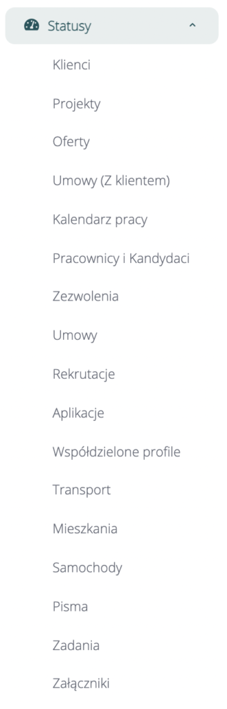 Statusy zostały przeniesione z Ustawienia > Konfiguracja > Statusy do Ustawienia > Statusy. Rodzaje obiektów, które posiadają możliwość konfiguracji formularzy znajduje się również w menu (poniżej).