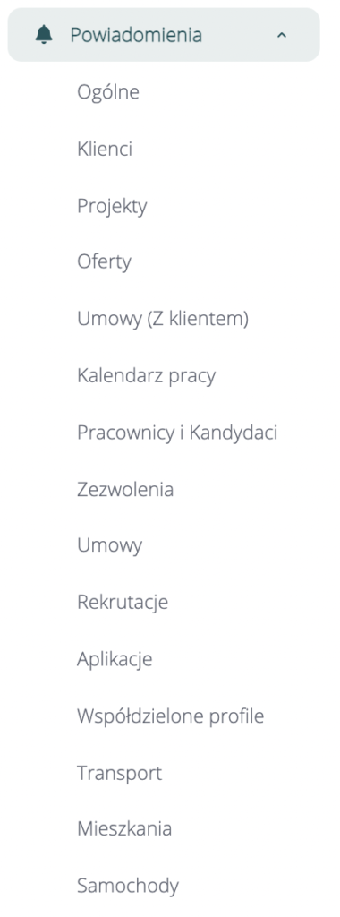 Powiadomienia zostały przeniesione z Ustawienia > Konfiguracja > Powiadomienia do Ustawienia > Powiadomienia. Rodzaje obiektów, które posiadają możliwość konfiguracji powiadomień również znajdują się w menu (poniżej).