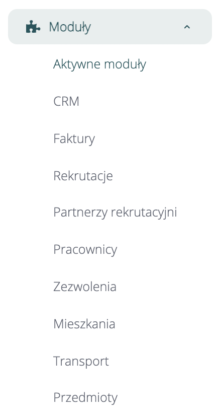 W sekcji moduły dostępne są wszystkie podstawowe moduły w systemie oraz ich najważniejsze elementy.