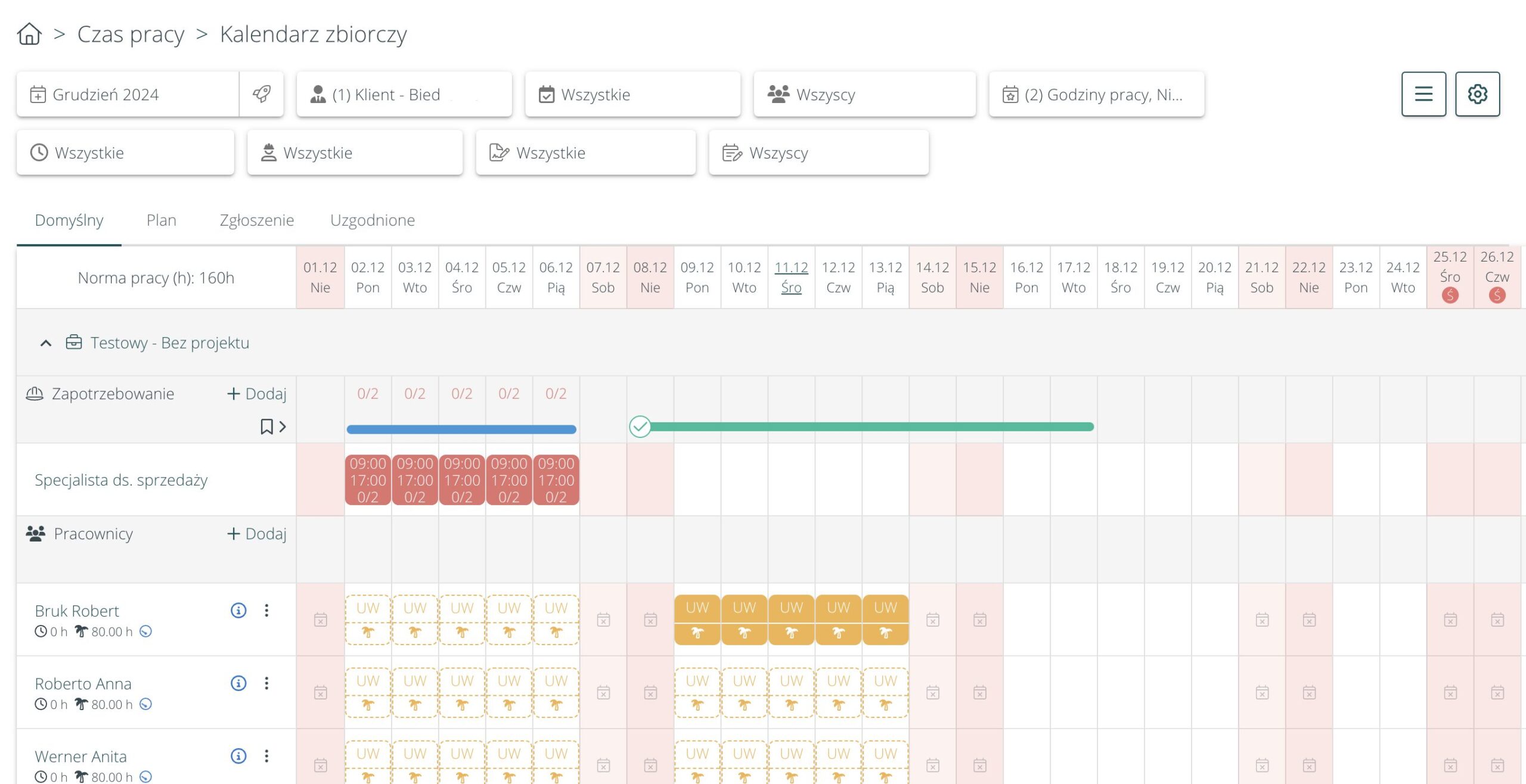Dodany plan urlopu można przekształcić w zgłoszenie urlopu lub urlop (realizację). System może powiadomić przełożonego pracownika o niezatwierdzonym planie urlopu w zdefiniowanym w ustawieniach czasie. Porównanie procesu tworzenia planów urlopowych ze standardowym procesem wnioskowania o urlop: Przejrzyste wyświetlenie planów urlopowych wielu pracowników dostępne jest z poziomu kalendarza zbiorczego (Czas pracy > Kalendarz zbiorczy). Prezentowane tam wpisy grafikowe można sprawnie filtrować, aby otrzymać przejrzysty widok planów urlopowych i urlopów: