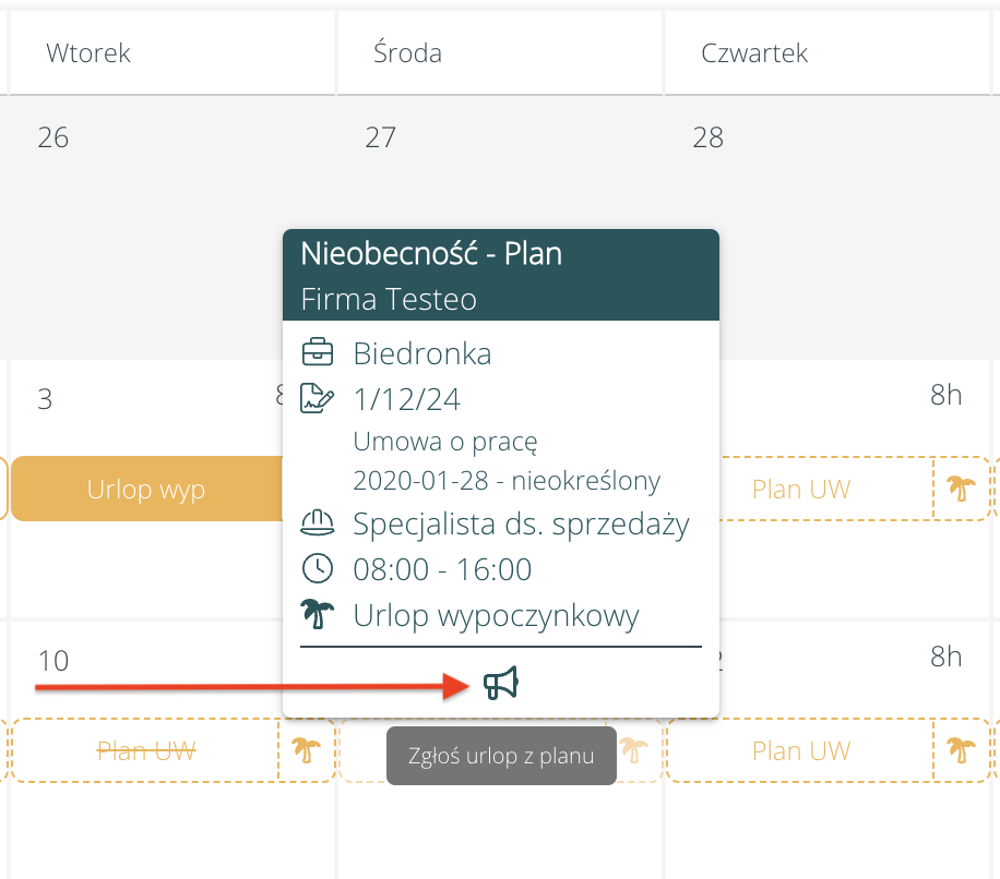 Po włączeniu planów urlopowych, pracownik z poziomu swojego kalendarza na profilu pracownika będzie mógł zgłosić propozycję planu urlopu: Po kliknięciu „Propozycja planu urlopu" pracownik może uzupełnić dane propozycji urlopu i zapisać. Zapisana propozycja zostanie wysłana do akceptacji odpowiedniej osobie (zgodnie ze zdefiniowanymi ścieżkami akceptacji wpisów grafikowych). Gdy propozycja zostanie zaakceptowana lub odrzucona – pracownik otrzyma powiadomienie mailowe. Po zaakceptowaniu propozycji planu, gdy pracownik będzie pewny, że w wybranym terminie chce wziąć urlop to może w łatwy sposób zmienić plan urlopu w zgłoszenie urlopu klikając w ikonę megafonu: Dodatkowe informacje: