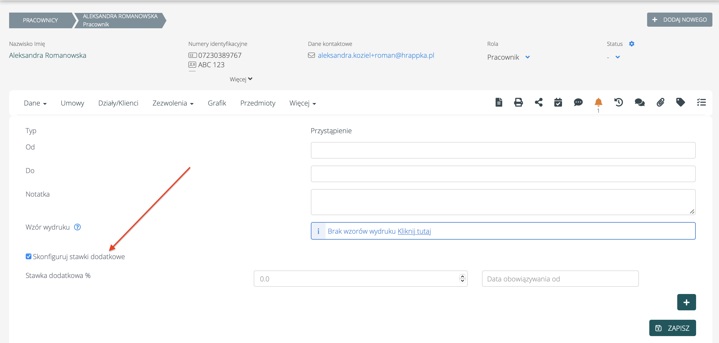 Stawki dodatkowe pracownika można zdefiniować podczas dodawania deklaracji przystąpienia pracownika do PPK, po kliknięciu checkboxa “Skonfiguruj stawki dodatkowe”.
