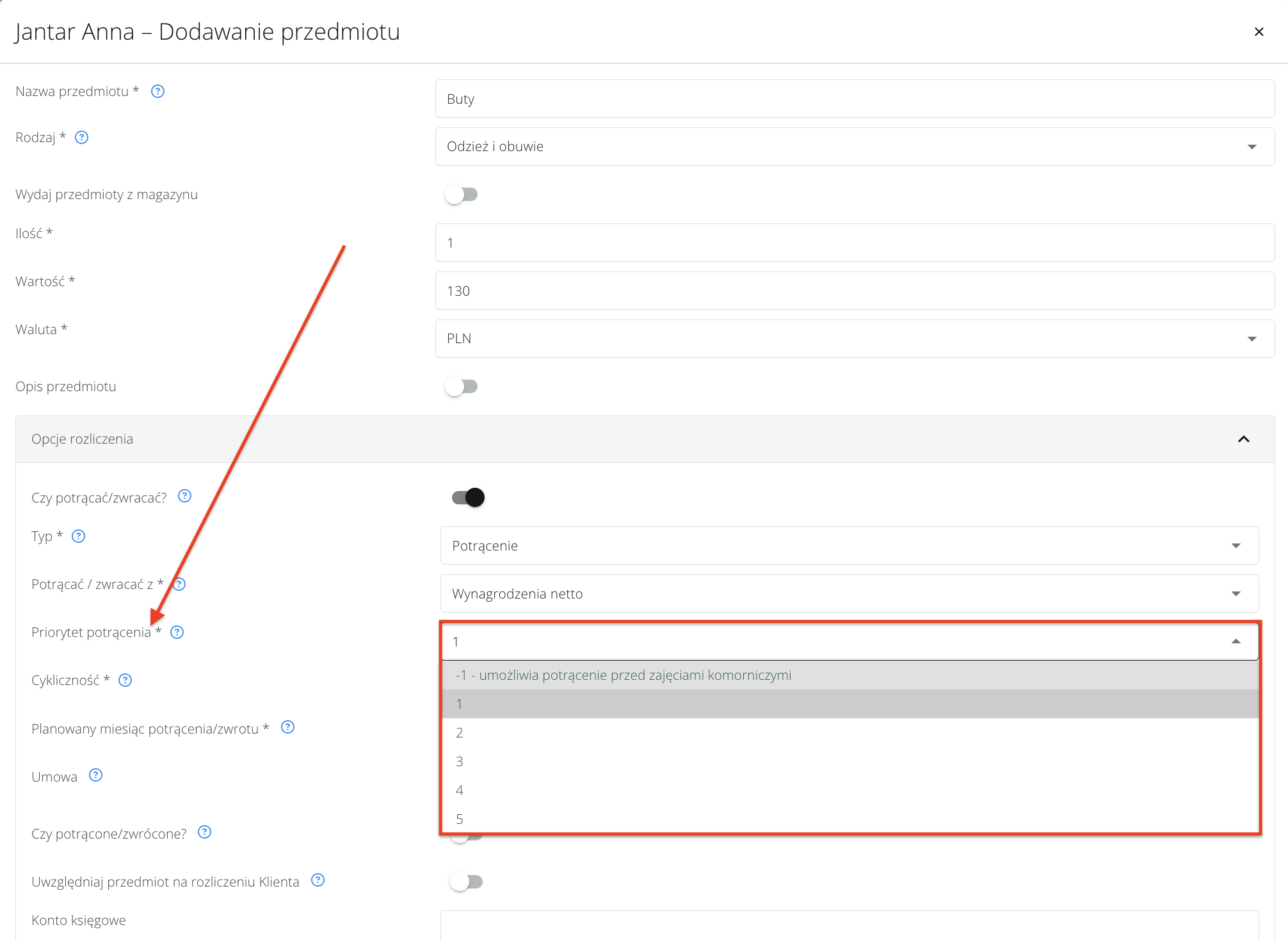 Podczas dodawania / edycji przedmiotu o typie „Potrącenie" istnieje pole „Priorytet potrącenia” (ERP > Przedmioty lub na profilu pracownika w Pracownicy > Lista pracowników > Dany pracownik > Przedmioty).