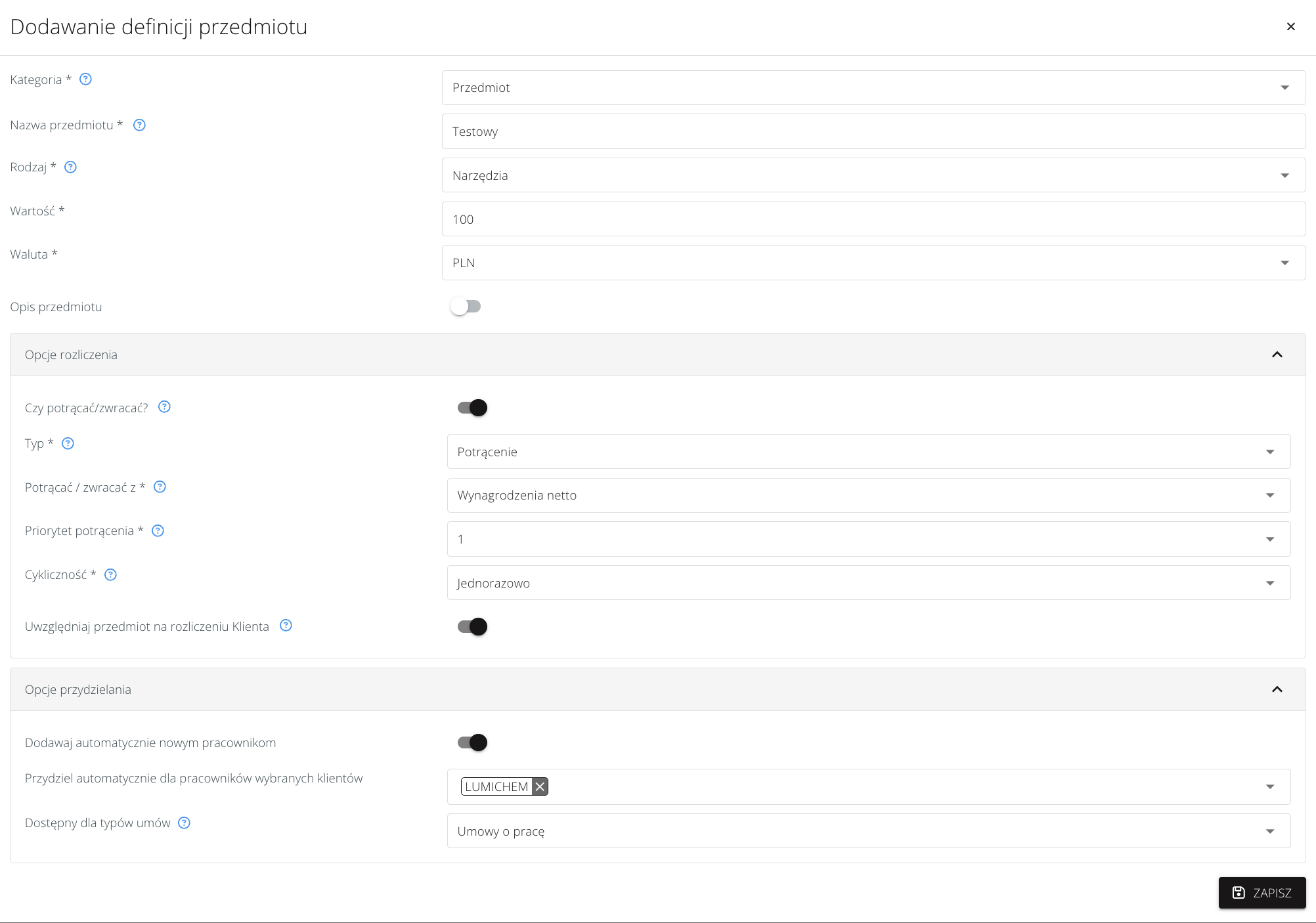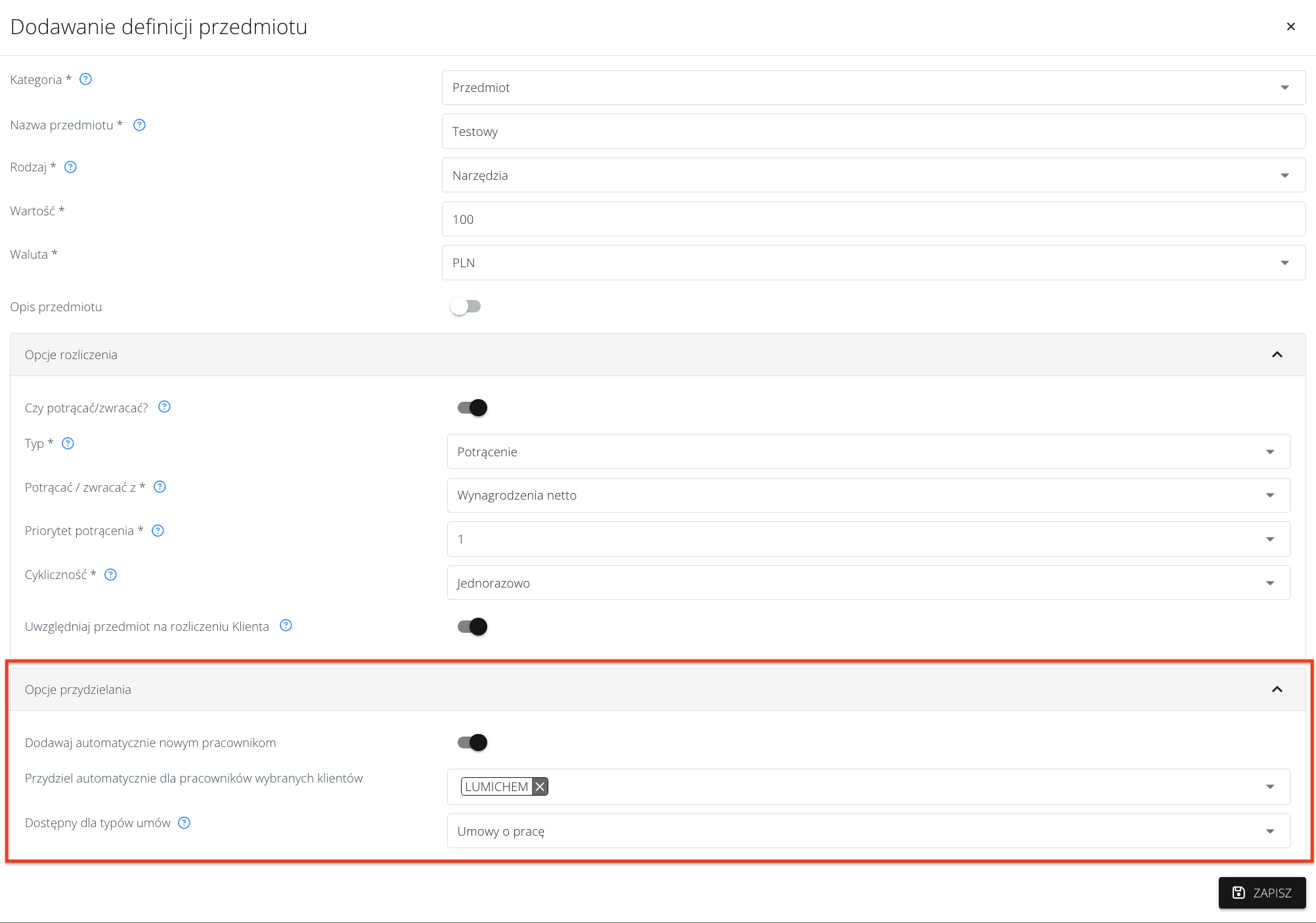 - zakładka Opcje przydzielania, która pozwala włączyć opcję Dodawaj automatycznie nowym pracownikom. Po włączeniu, możemy zdefiniować pracowników, którym dodawać przedmiot: