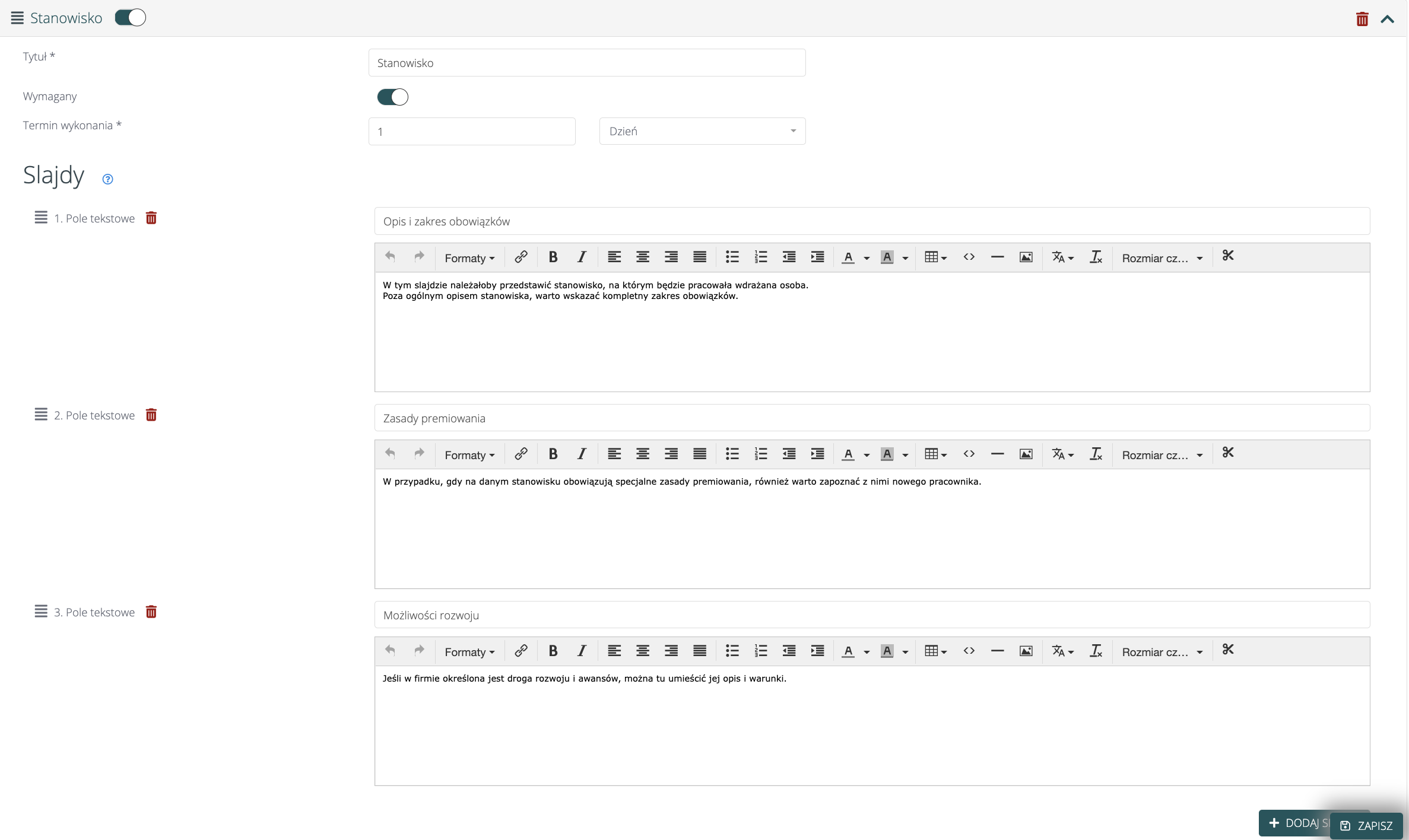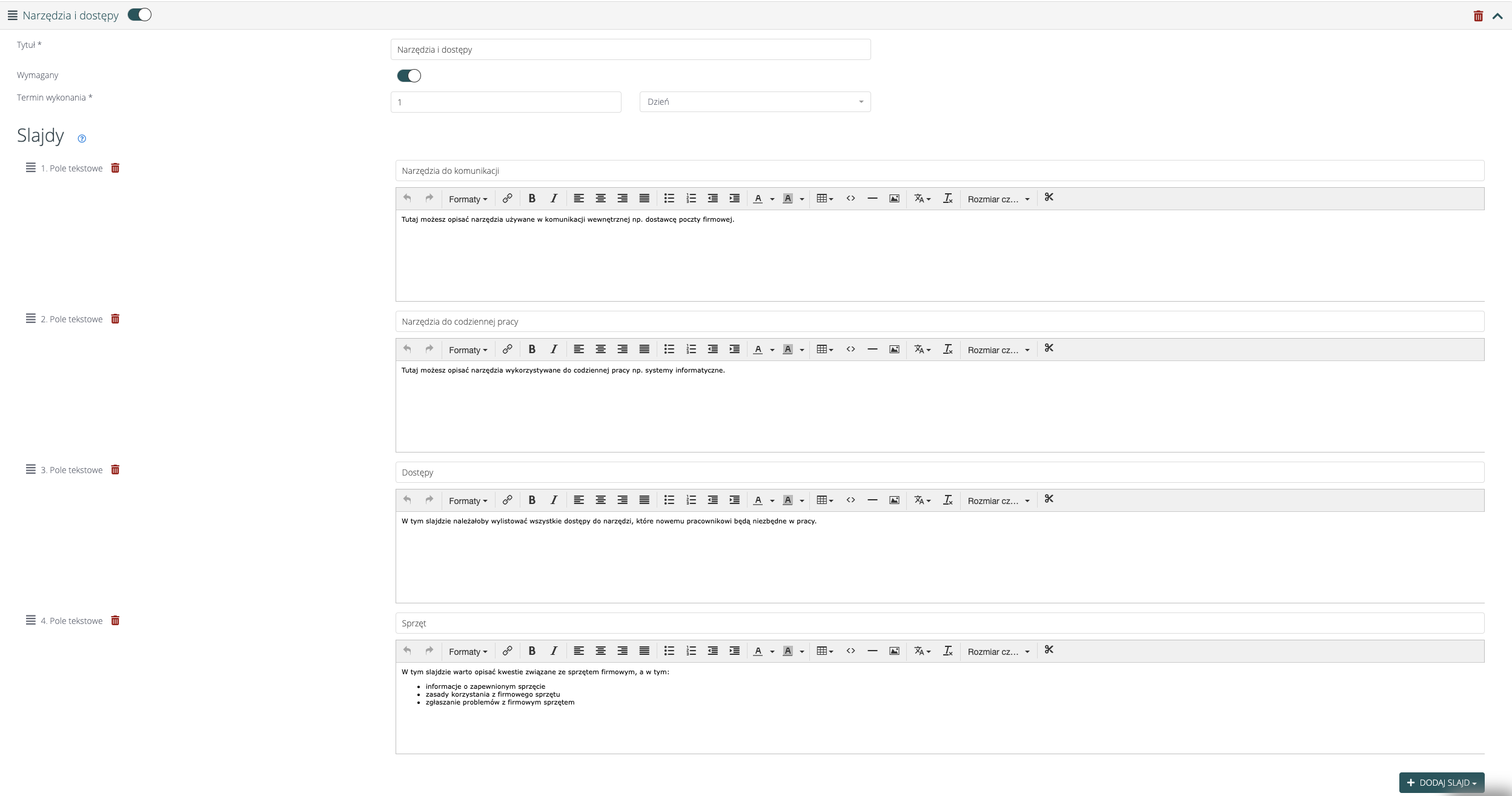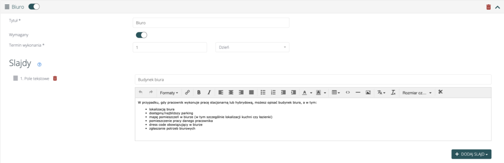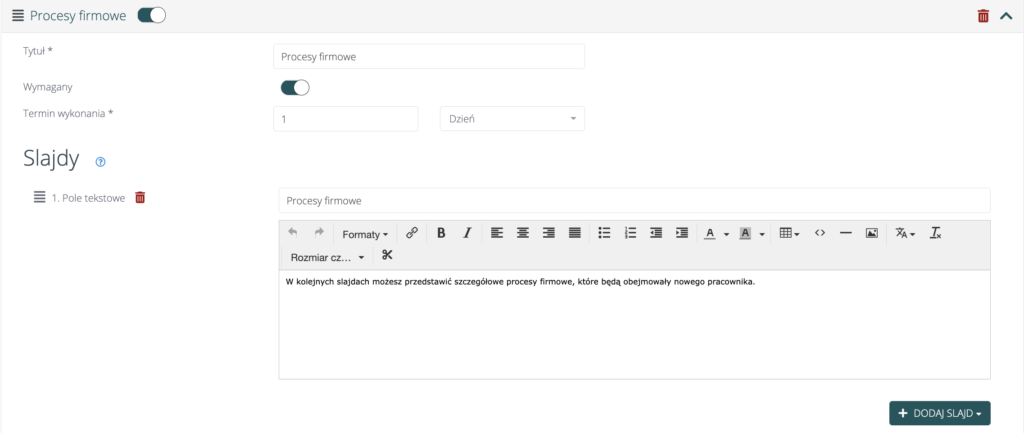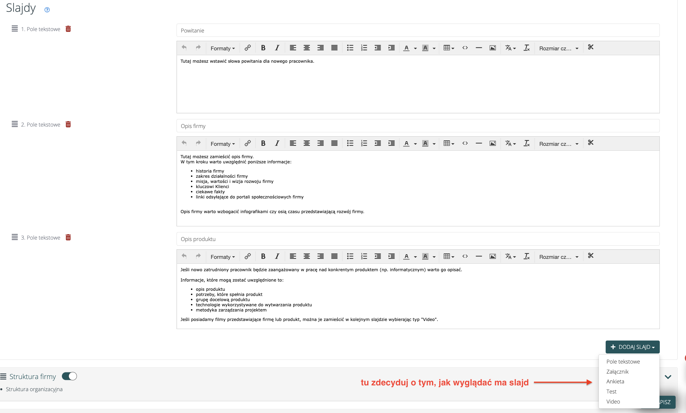 Pamiętaj, że dodając slajdy możesz zdecydować o ich układzie. Do wyboru masz pole tekstowe, załącznik (np. regulamin), ankieta (np. zadowolenie pracownika po onboardingu), test (np. test wiedzy po zakończonym onboardingu) lub video.