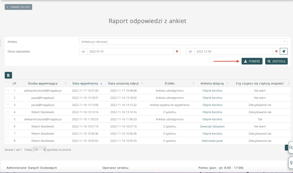 Raport wykazuje informacje na temat wypełnionych ankiet. Filtrując wyniki należy wpisać interesującą ankietę (np. Ankieta po rekrutacji) oraz przedział czasowy.