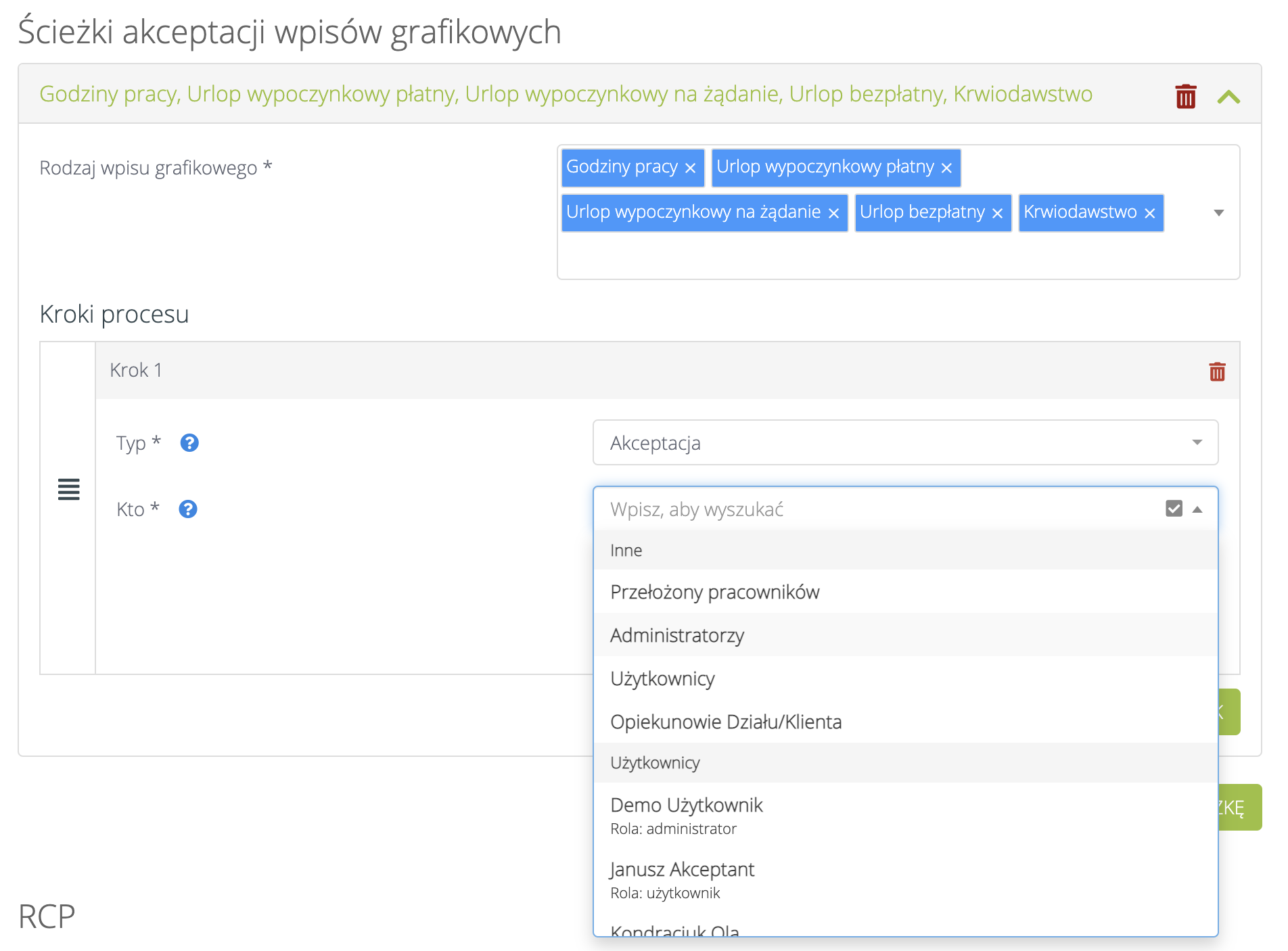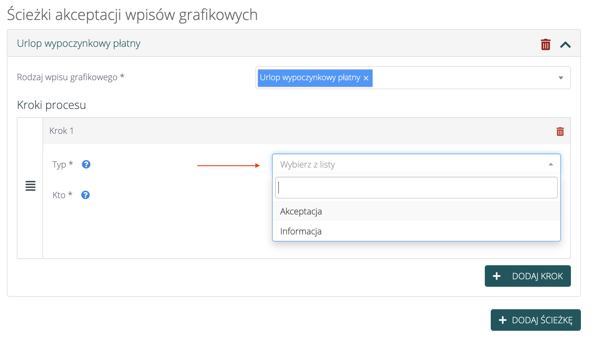 Po wyborze typu kroku należy zdefiniować kto ma akceptować wpis / otrzymywać informację o zgłoszeniu (Pole „Kto”).