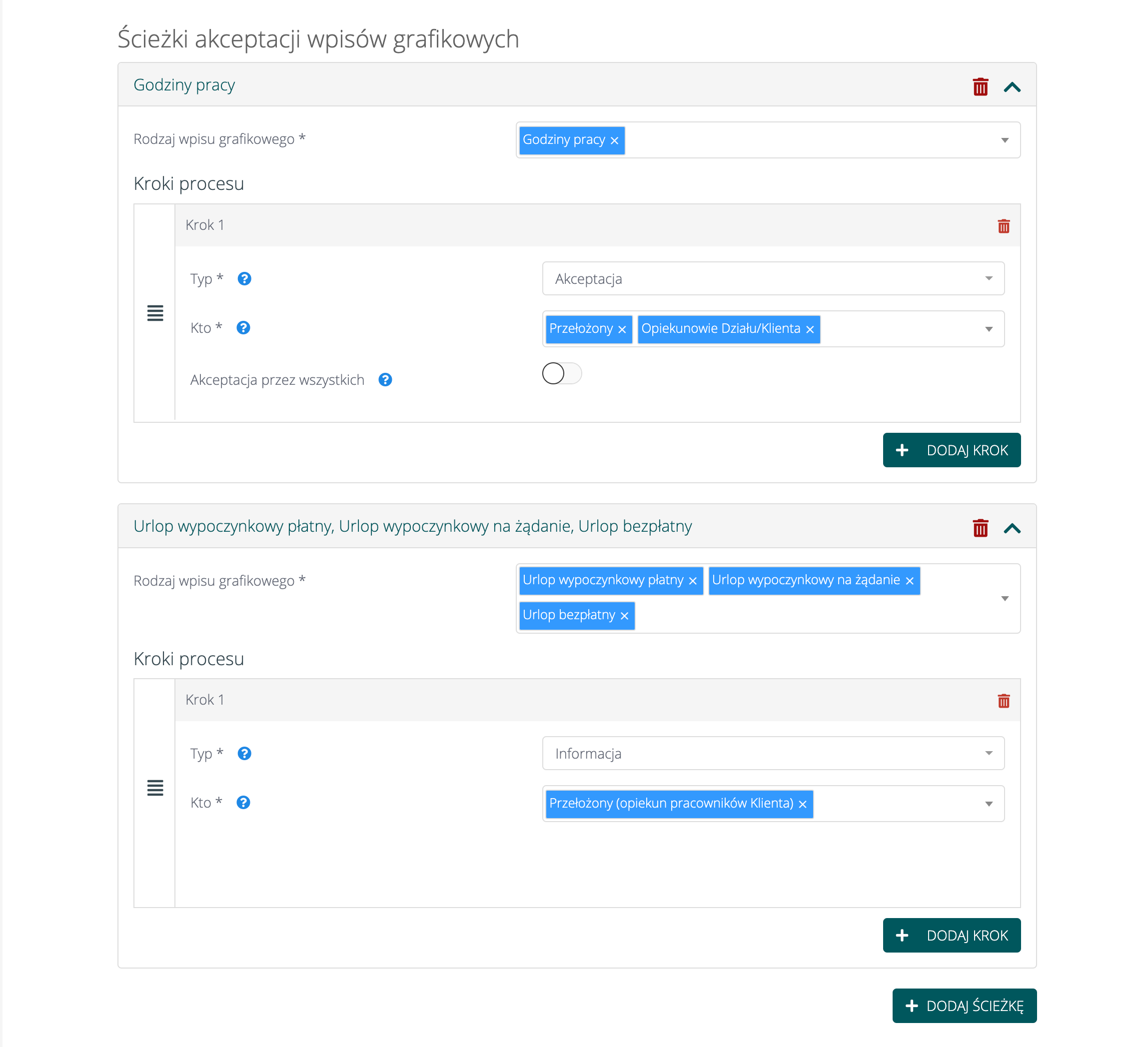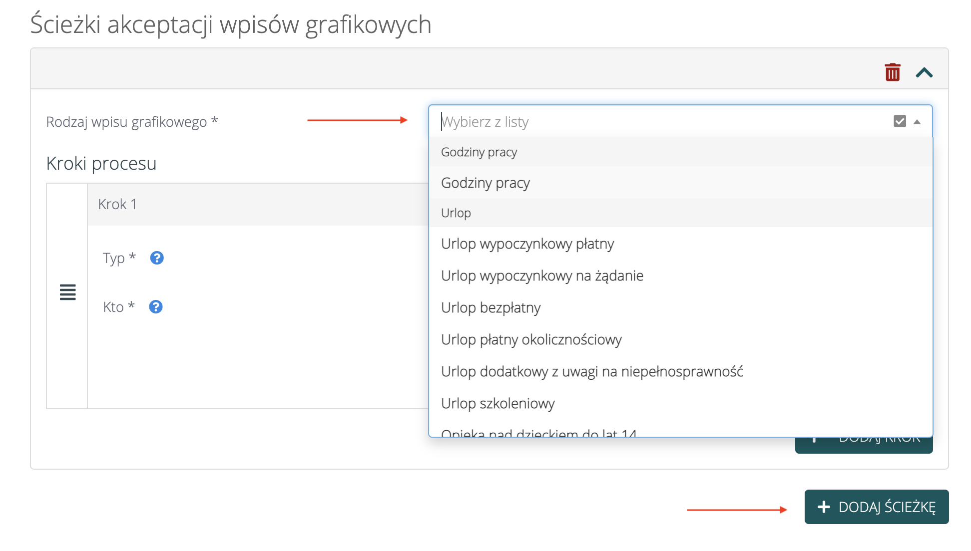 Aby dodać ścieżkę, należy kliknąć w „Dodaj ścieżkę”. Następnie należy wybrać jakich wpisów grafikowych dotyczy ścieżka. Do wyboru mamy godziny pracy oraz wszystkie typy nieobecności.