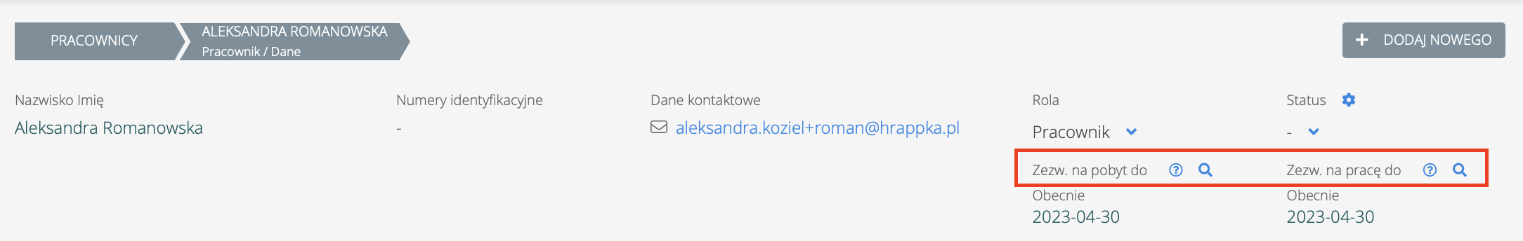 W celu sprawnej weryfikacji okresu legalizacji pobytu oraz pracy cudzoziemca, na profilu pracownika w top panelu, przy Zezwoleniu na pobyt i Zezwoleniu na pracę należy kliknąć na ikonę lupy.