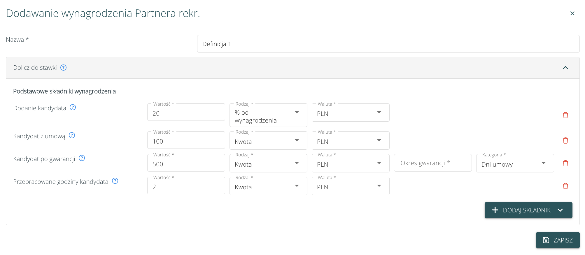 Następnie należy zdefiniować składniki, które chcemy doliczać do stawki partnera rekrutacyjnego. Dostępne składniki: