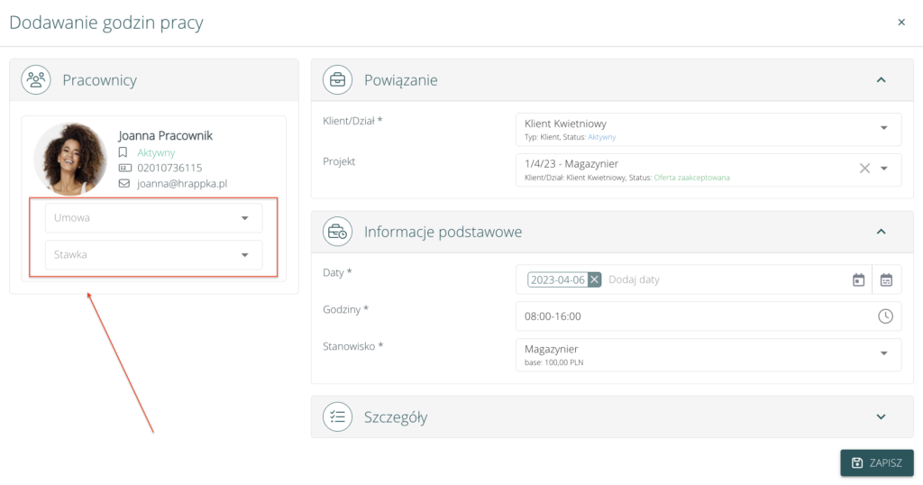 Dodawanie planu pracy / godzin pracy – wybór stawki #