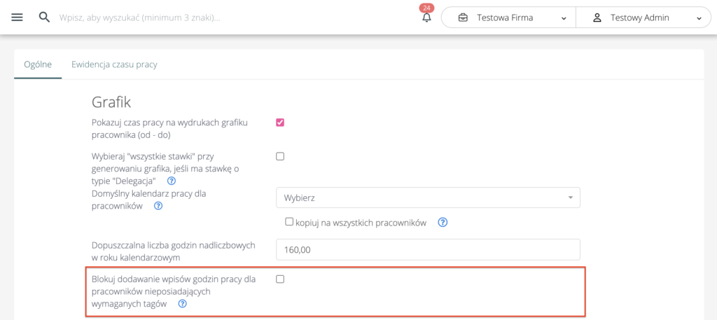 Co więcej, dodaliśmy również możliwość blokowania dodawania takiego pracownika do planu przez użytkowników. Opcja „Blokuj dodawanie wpisów godzin pracy dla pracowników nieposiadających wymaganych tagów ” dostępna jest w Ustawieniach > Moduły > Pracownicy > Ogólne, w sekcji Grafik. Zaznaczenie opcji spowoduje blokadę dodawania wpisów grafikowych (na wybrane stanowisko) pracownikom nieposiadającym tagów odpowiadających tagom ustawionym na stanowisku. Blokada nie dotyczy administratorów.